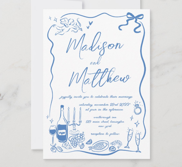 From romantic florals to quirky cartoons, hand-drawn illustrations are highly versatile. Couples can tailor the designs to match their wedding theme—boho, vintage, modern, or rustic—ensuring their invitation feels timeless rather than trendy.